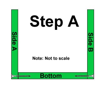 Step A - Place the "BOTTOM" on your workbench and attach "SIDE A" and "SIDE B" to the base using 1-5/8" galvanized deck screws. The screws should go through the "SIDE PIECES" into the "BOTTOM".