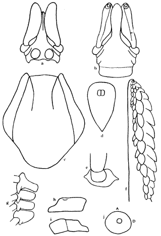 | I. holocyclus: female; a, capitulum (dorsal view); b, capitulum (ventral view); c, palpal article I (lateral view); d, hypostome; e, scutum; f, anal grooves; g, spiracular plate; h, tarsus I; i, tarsus IV. | Fig. 36.-I. cornuatus, female: a, capitulum (dorsal view); b, capitulurn (ventral view); c, scutum; d, anal grooves; e, palpal article 1 (lateral view); f, hypostome; g coxae; h, tarsus I; i, tarsus IV; j, spiracular plate. |